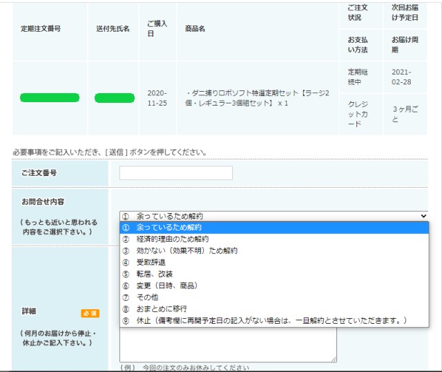 - 「詳細」欄に、いつのお届けから解約したいかを書く