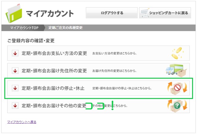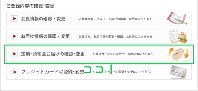 マイアカウントにログインしたら「定期・頒布会お届けの確認・変更」をクリックします。