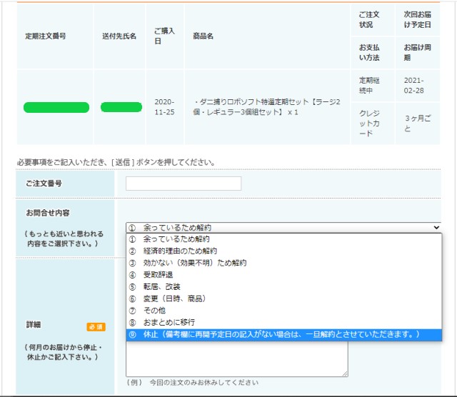 ※すぐ上の定期注文番号をコピペでOK - 「お問合せ内容」から⑨休止を選択